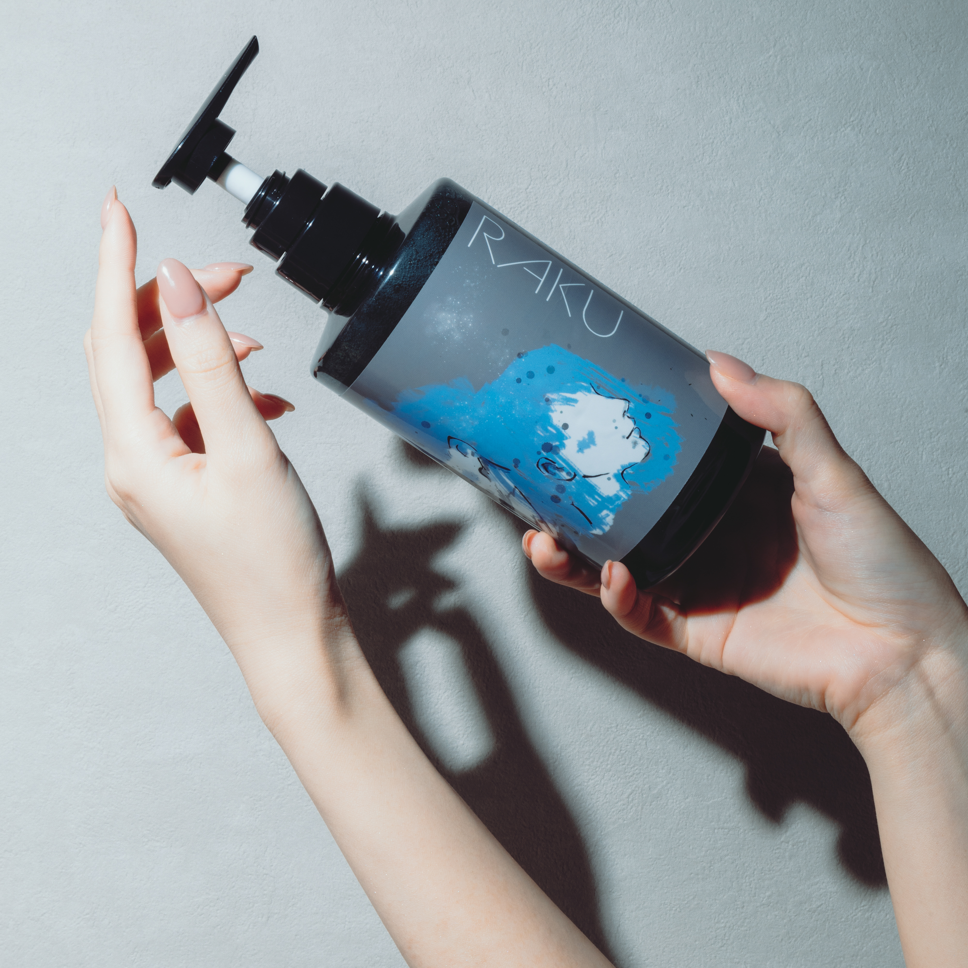 今までにないラベルで目を引く商品。今や多様性の時代で、差別のない社会が浸透するようにと願いを込めたパッケージ。また、全身シャンプーがまだ社会的に定着していないからこそ、RAKUが先陣を切り社会に広げていきたい。そんな思いで作られました。